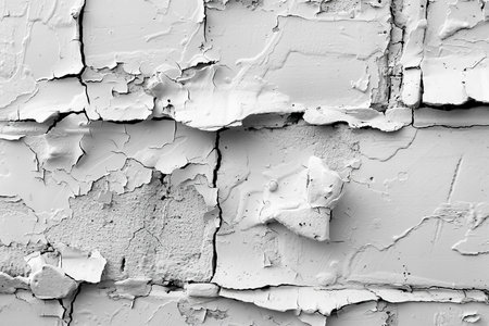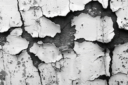 This image showcases a close-up view of peeling paint on a textured surface. The monochrome composition highlights the details of the flaking paint, revealing layers and cracks. The lighting emphasizes the irregularities, suggesting a weathered exterior. Suitable for a range of uses, this image could serve as a visual element.