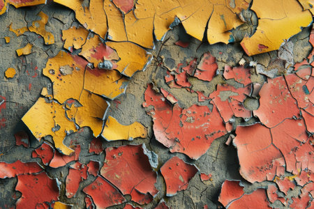 This close-up image captures the intricate details of peeling paint on a metal surface, showcasing distressed textures in vibrant yellow and red.