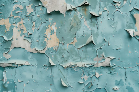 Faded turquoise wall exhibits layers of peeling paper creating a textured surface that reflects age and wear.