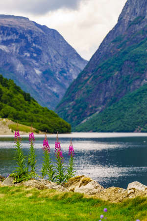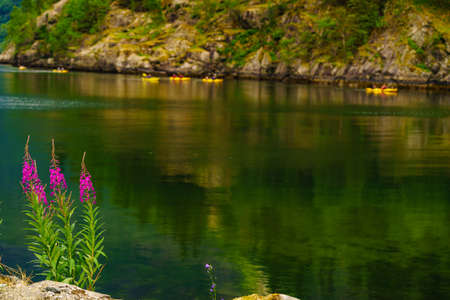 Lake, river on norwegian fjord shore with pink flowers and people kayaking on water in the background. Tourism vacation and travel.