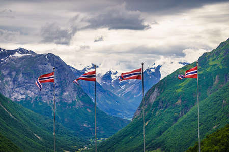 Norwegian flags waving against mountains landscape. Travel, holidays and adventure concept.