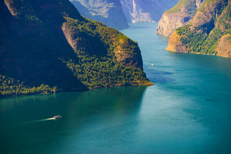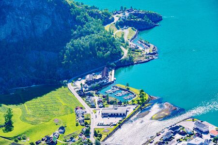 Tourism vacation and travel. Beautiful view on summer fjord Sognefjord, Gudvangen Norway Scandinavia.