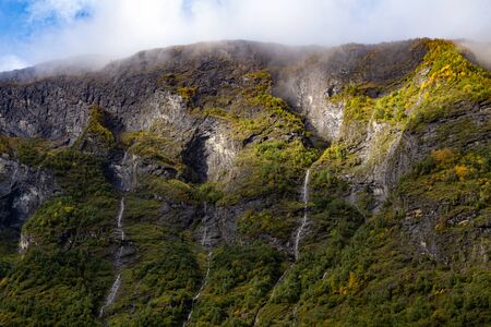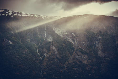 Moody landscape with a waterfall falling on the Naeroyfjord in Gudvangen, Norway