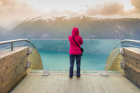 Tourism and travel. Woman tourist nature photographer taking photo with camera, enjoying Aurland fjord landscape from Stegastein lookout, Norway Scandinavia.
