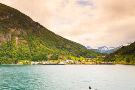 Tourism vacation and travel. Mountains landscape and fjord in Norway Scandinavia Europe. Norddalsfjorden as seen from ferry. Beautiful nature