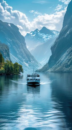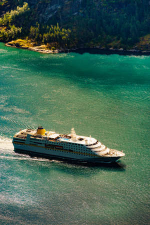 Tourism and travel. Mountains landscape and cruise liner ship sailing on the fjord, Norway Scandinavia.