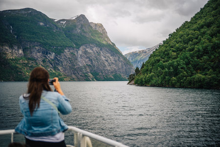 Woman Enjoying Spectacular Views of Majestic Fjords from a Boat Journeying Through Scenic Norwegian Landscape