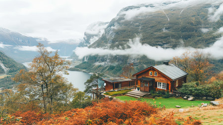 Dramatic beautiful nature landscape in Norway with a small town under fog