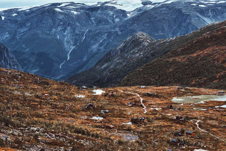 Beautiful scenic view of massive scandinavian mountains at autumn season.