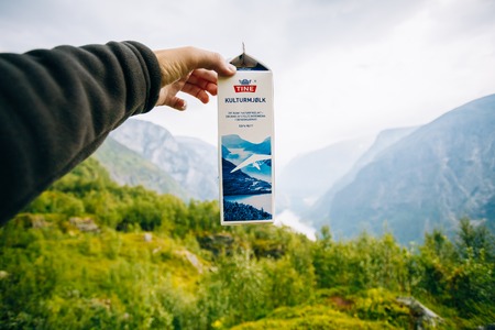 Aurland, Norway - August 2, 2014: Package curdled milk Kulturmjolk or sour from Tine in hand on background of Norwegian mountains. TINE SA is the largest Norwegian dairy product cooperative consisting of around 15,000 farmers and 5,600 employees