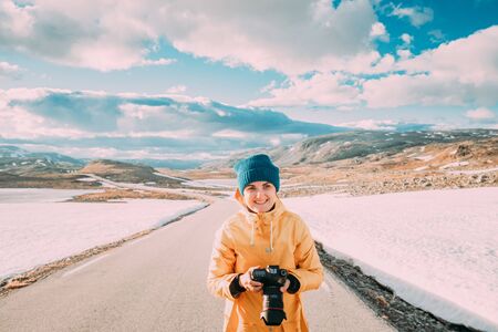 Aurlandsfjellet, Norway. Young Happy Woman Tourist Traveler Photographer Taking Pictures Photos Of Aurlandsfjellet Scenic Route Road. Norwegian Landmark And Popular Destination