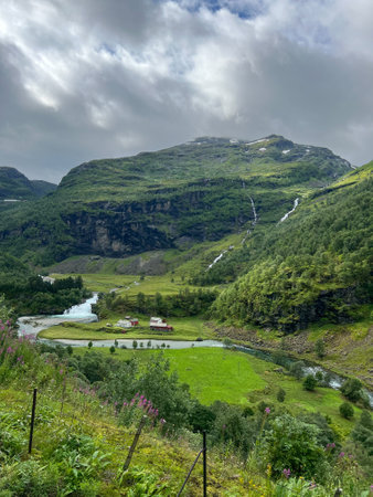Idyllic view of Kårdalsfossen Waterfall in Myrdal, Norway, with red rural houses, the Flåm River, lush green valley landscapes, and majestic mountains under a cloudy sky. Norwegian nature concept