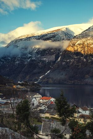 Amazing dramatic view of the fjords and mountains. Aurlandsfjord fjord landscape in Norway Scandinavia. National tourist road known as The snow road.
