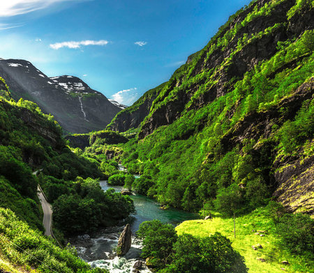 Beautiful summer landscape with a mountain river in the mountains. Norway