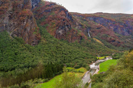 Amazing beautiful view of the Aurlandsfjord in Norway Scandinavia with green mountains and river