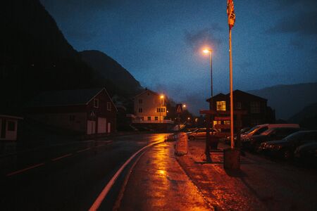 night landscape of houses lit by yellow lanterns in norway in rainy weather