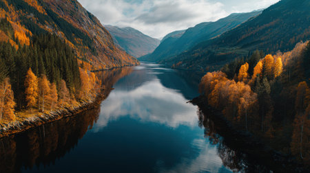 A stunning view of a tranquil river reflecting vibrant autumn colors, framed by majestic mountains and lush forests, perfect for nature lovers.