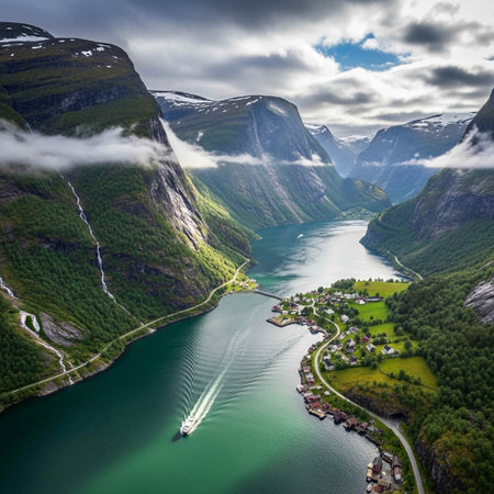 Fjord Geirangerfjord with big cruise ship. Travel and holidays