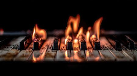 This image features a piano keyboard engulfed in flames, highlighting the burning keys. The composition is dramatic, with the fire providing a strong visual contrast against the dark background. The scene suggests concepts of transformation or destruction, suitable for various editorial and conceptual projects.