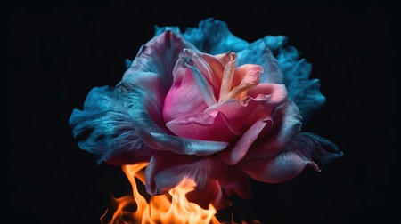 Aesthetic burning rose flower, realistic flame effect on dark background. Generative Ai
