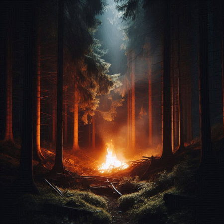 Glowing fire patch in dark forest with misty atmosphere creating mysterious mood