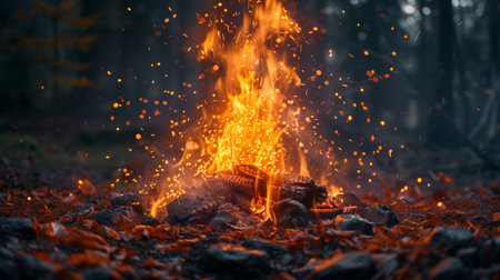 Intense campfire in the forest with vibrant flames and sparks. A stark representation of wildfire risk during dry seasons.