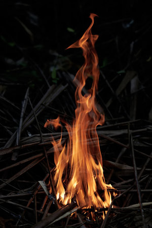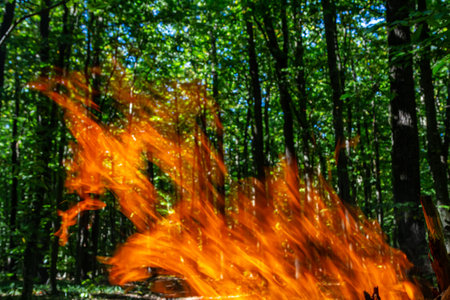 Flame of charcoal fire. Hearth for cooking and heating. Danger in the forest.