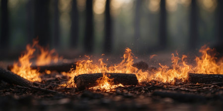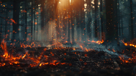Burning forest floor with glowing embers and sparks creating dramatic and intense natural scene at dusk