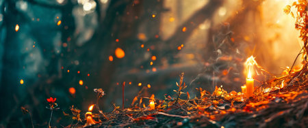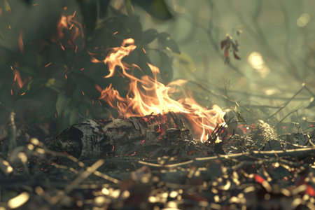 Burning fallen branches create glowing embers and sparks in dark forest setting, evoking warm and intense atmosphere