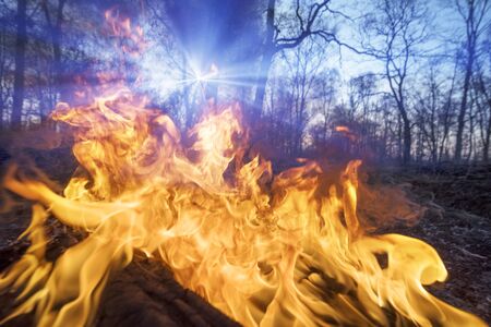 Forest fire at sunset. Fire in the forest. Nature composition.
