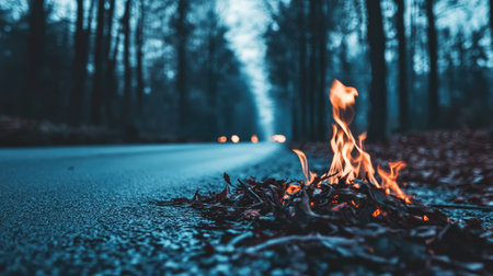 A captivating scene depicting a small fire burning on a pile of leaves beside a quiet road in an autumn forest, evoking peaceful vibes at twilight.