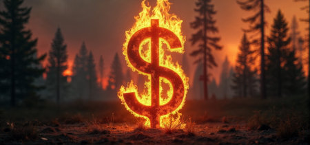 The dollar symbol engulfed in flames contrasts sharply with the surrounding trees, conveying a striking visual of the destructive impact of human greed on the environment.
