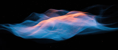 Dance of concentrated colored particles, computer generated. 3d rendering abstract background with fluid clouds