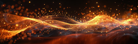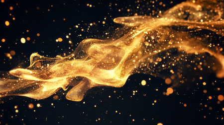 Abstract golden sparkles wave across a dark, black background. The image features a sense of movement and energy with the flowing particles.