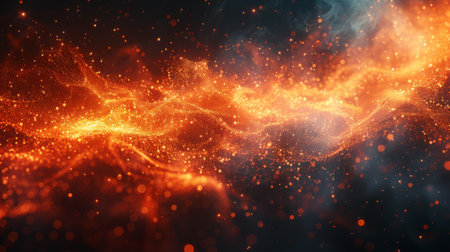 An abstract illustration features vibrant orange and red particles, creating a sense of movement against a dark backdrop. The composition showcases dynamic energy, with elements resembling flames or sparks. This image could be suitable for various commercial uses, including website backgrounds or visual design projects, offering a sense of drama.