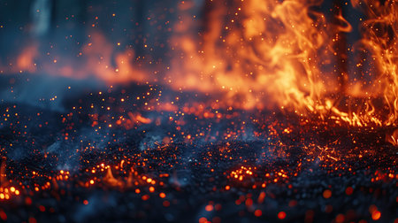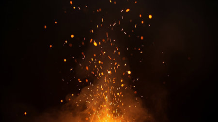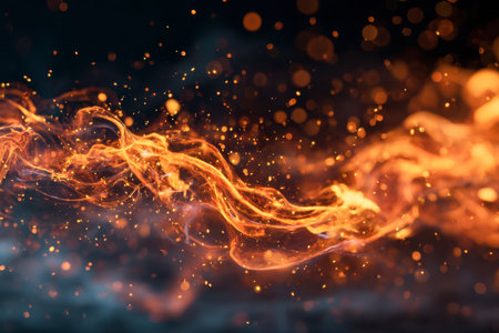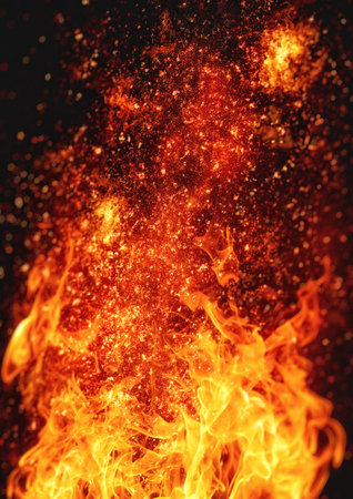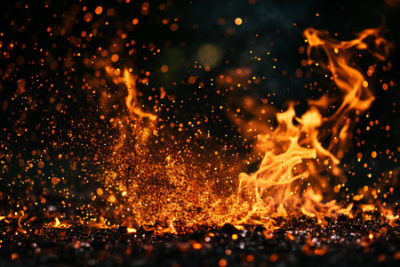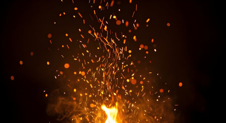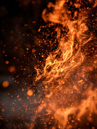 Captivating image showcasing vibrant flames and dancing sparks in a dark setting, creating a mesmerizing atmosphere with glowing elements and smoke.