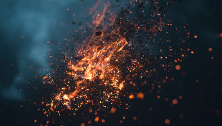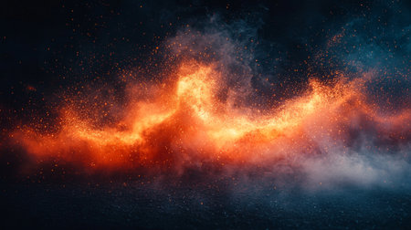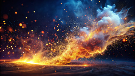 Abstract fiery explosion with sparks against a dark, smoky background