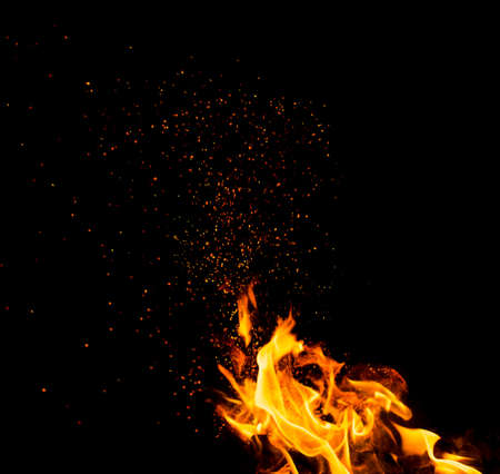 Fire flames with sparks on black background. Abstract background for design.