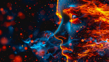 Futuristic digital face with neon lights, flowing data streams, glowing particles, high-tech aesthetic.