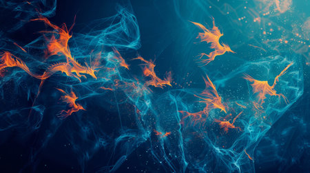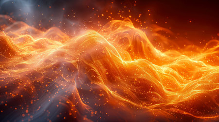An abstract illustration features vibrant orange and red particles, creating a sense of movement against a dark backdrop. The composition showcases dynamic energy, with elements resembling flames or sparks. This image could be suitable for various commercial uses, including website backgrounds or visual design projects, offering a sense of drama.