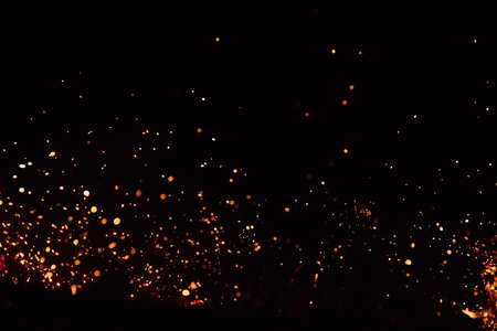 Fire sparks background. Abstract dark glitter fire particles lights. Fire embers particles isolated on black background.