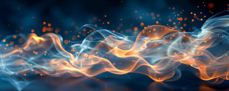 Abstract fiery stream with dark blue smoke, glowing embers, and bokeh lights. Dynamic, energetic, and intense visual