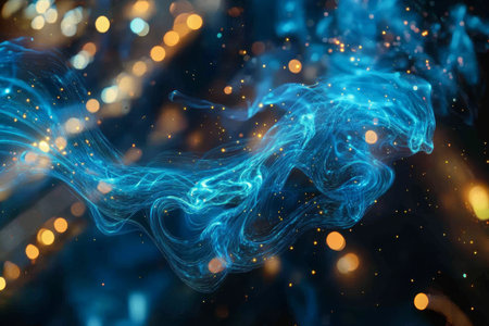 Surreal glowing blue smoke swirling in a cosmic background with sparkling star like particles