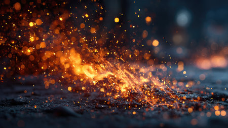 This mesmerizing image captures fiery sparks and glowing embers rising from the ground, enveloped in a soft bokeh background. The dynamic energy and warmth create an enchanting atmosphere perfect for artistic projects.
