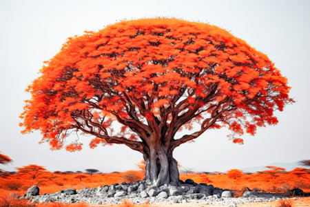 A stunning red flowering tree stands majestically in a lush tropical landscape, surrounded by vibrant green foliage and majestic mountains, evoking tranquility and natural beauty.