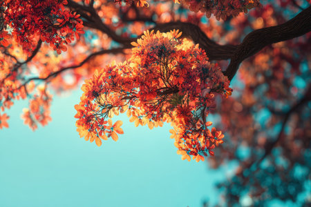 Vibrant orange flower blossoming on tree branches against soft blue background