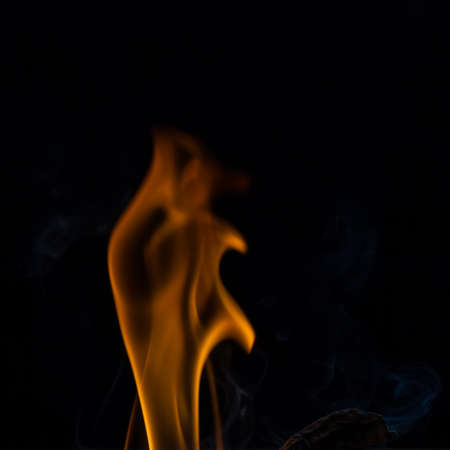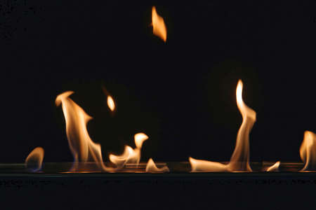 Fire flames on black background isolated. Burning gas or gasoline burns with fire and flames. Flaming burning sparks close-up, fire patterns. Infernal glow of fire in the dark with copy-space