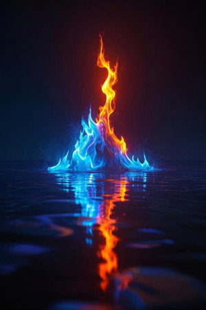 Fire on water surface, dramatic contrast. Elemental nature and danger concept