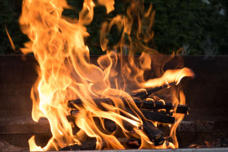burning firewood in a barbecue or barbecue. photo of a fire with flames in the street