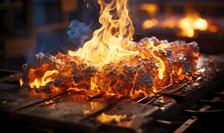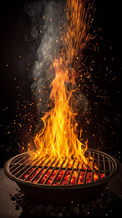 A close-up shot of a grill with intense flames rising from it, with sparks flying in the dark background, creating a dramatic and fiery scene.